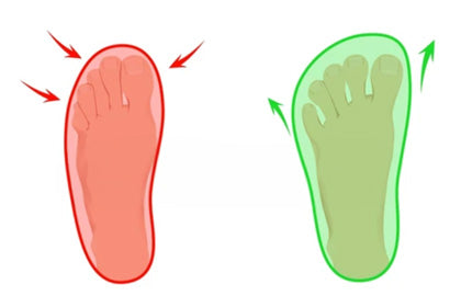 従来の靴にはほとんどすべてかかとの高さがあり、裸足シューズはかかとからつま先までフラットです。かかとの高さがある靴を履くと、足と脚の後ろの筋肉や腱は短縮した状態に保たれ、その状態で機能します。