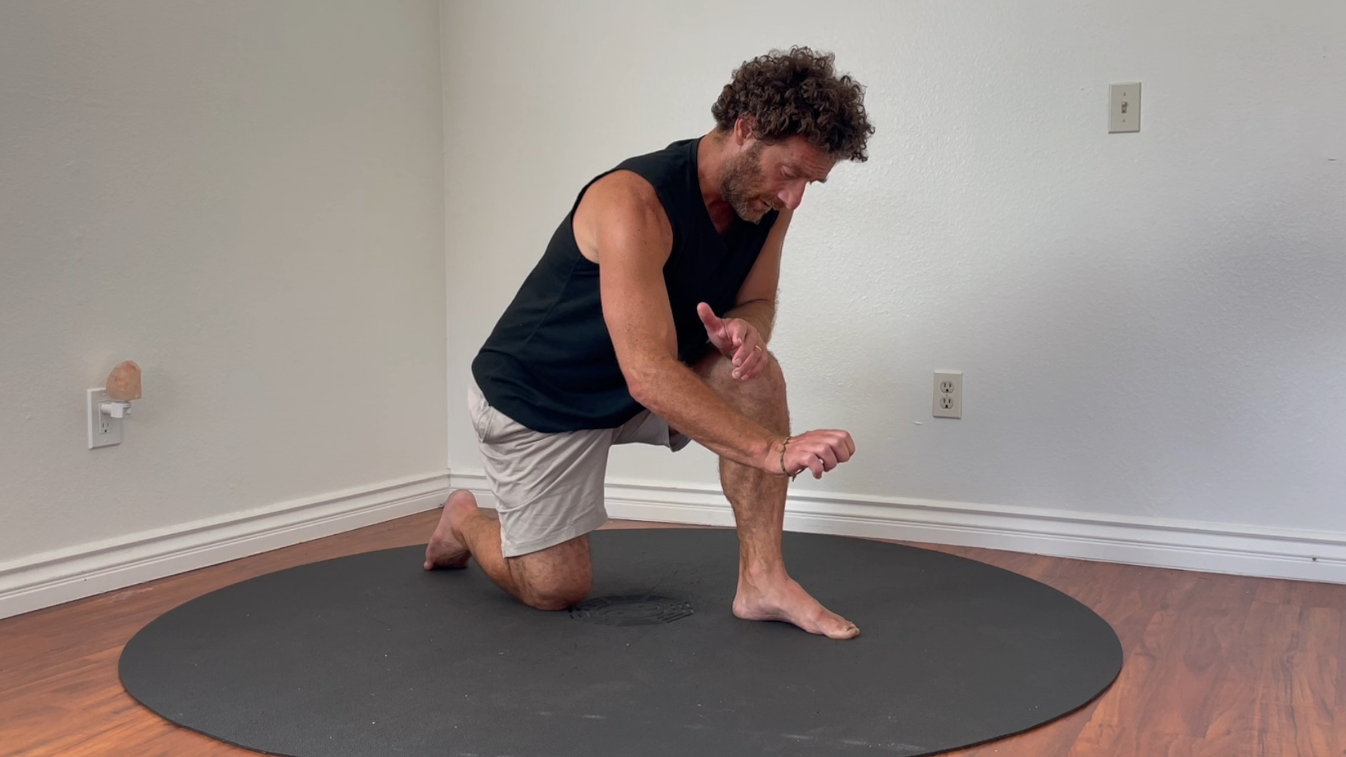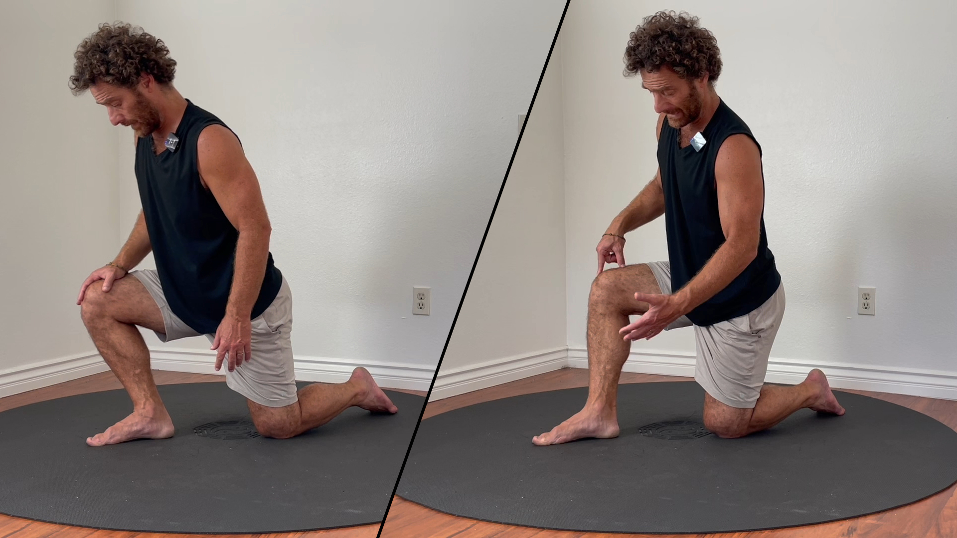 再びハーフニーリングの姿勢から始め、足のトライポッドを確認します。