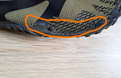 また、岩場でのトレッキング中、つま先が岩にぶつかったとき、衝撃を受け止めるのはゴム製のつま先プロテクターではなく、親指上の生地部分であることがよくあります。