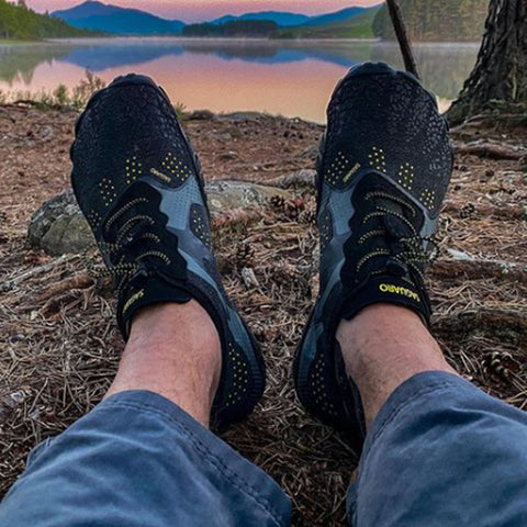 日常生活でよく使われる言葉が二つあります。ゼロドロップとは、つま先とかかとの間に高さの差がないことを意味します。この用語は、ほとんどの人がヒール付きの靴(8mm以上)を履いているため、マーケティングでよく使われます。伝統的なランニングシューズは4〜14mmのドロップがあります。ゼロクッションとは、足の下にクッションがない状態で、天候や地形からの最低限の保護のみがあることを意味します。裸足の感覚を再現するために、可能な限り少ないパッドで靴を作るという考え方です。これにより、一日中周囲の状況を感じることができ、足元の石や濡れた葉、凹凸のある表面に誰かが足を踏み入れたときに飛んでくる小石まで、すべてを感じることができます。また、つま先や圧力点の間にあるリテーナーを取り除くことで、感覚がより敏感になります。